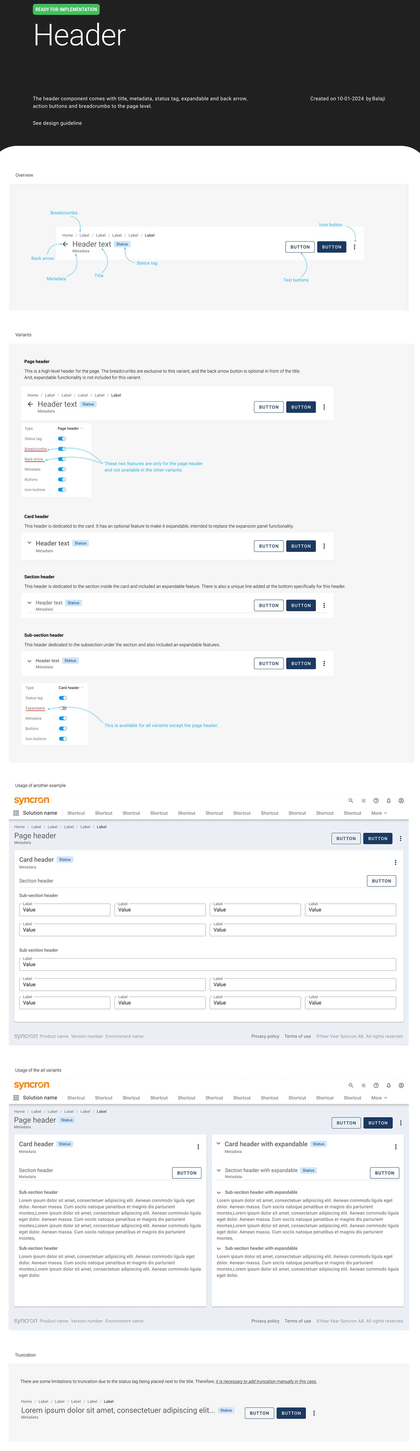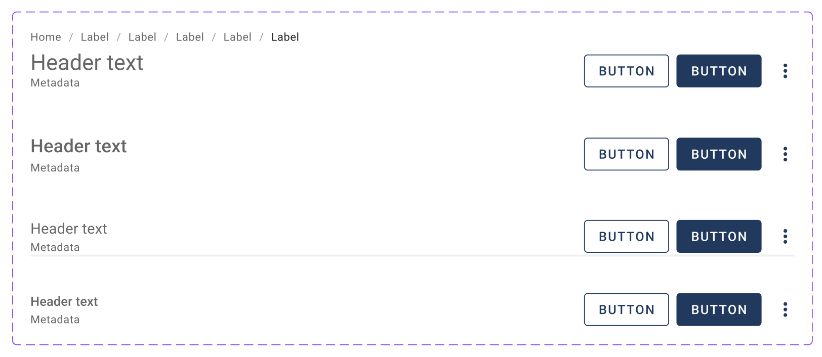 - Variants: The header has four variants—Page Header, Card Header, Section Header, and Sub-section Header. Only the Section Header includes an underline, distinguishing it from the Sub-section Header.